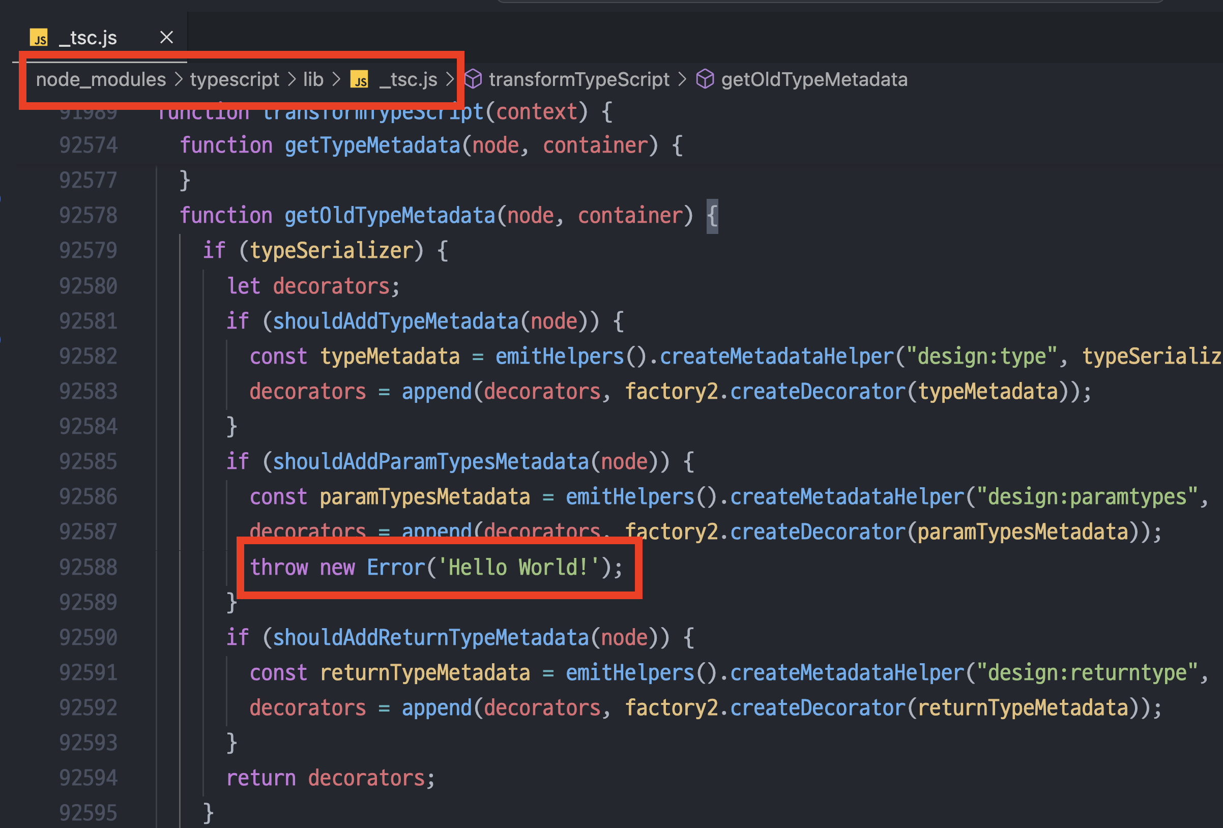 node_modules의 트랜스파일된 tsc 코드를 살펴봤을 때, lib/_tsc.js 안에서 해당 코드를 찾을 수 있었습니다. 여기에 에러를 심고 tsc를 호출합니다.