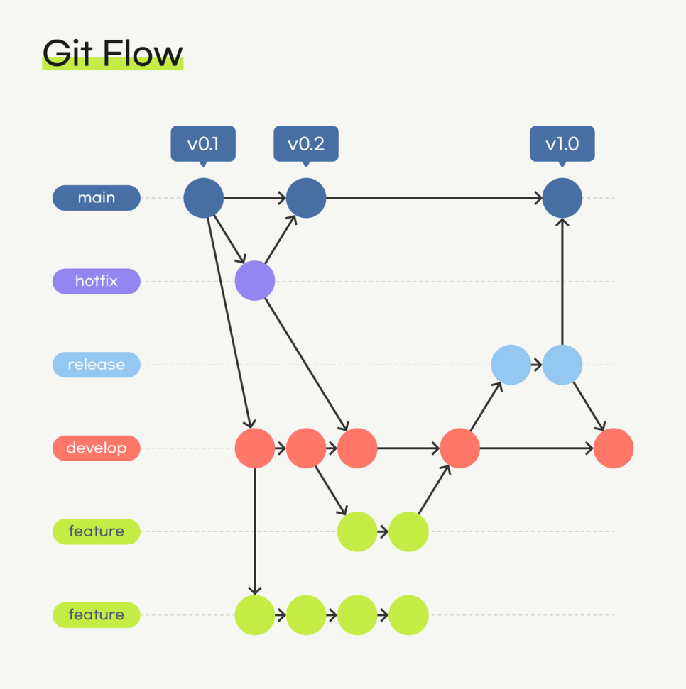 Git-flow는 대표적인 branch 전략 중 하나로 대규모 프로젝트에서 사용할 때 큰 장점을 보인다. feature, develop, release, main(master), hotfix 브랜치로 이루어진 전략이다.