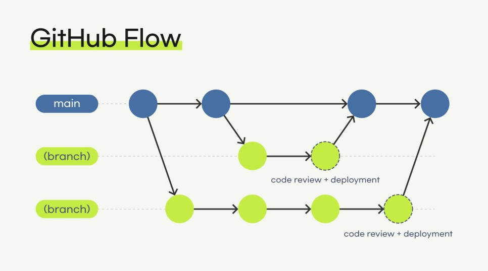 앞서 알아본 Git-flow는 대규모 프로젝트에서 사용할 경우 관리가 용이하다는 장점이 있다. 하지만 그만큼 많은 브랜치를 관리해야 한다는 복잡함도 있다. Github-flow는 이런 Git-flow의 단점을 해결할 수 있는 branch 전략이다. Github-flow는 main(master), (branch) 브랜치로 이루어져 있다. Github-flow 전략은 main 브랜치를 통해 모든 브랜치가 생성되고 생성된 브랜치 이름을 통하여 기능 구현이나 버그 수정 등의 생성 목적을 명시한다.