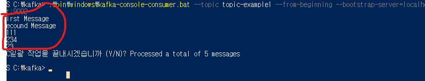 consumer.bat 실행시에는 --from-beginning옵션을 추가한다. 이 옵션은 현재 서버의 저장된 가장 첫 메시지 부터 수신하겠다는 의미이다.