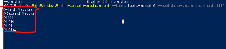 .\bin\windows\kafka-console-producer.bat --topic topic-example1 --bootstrap-server=localhost:9092