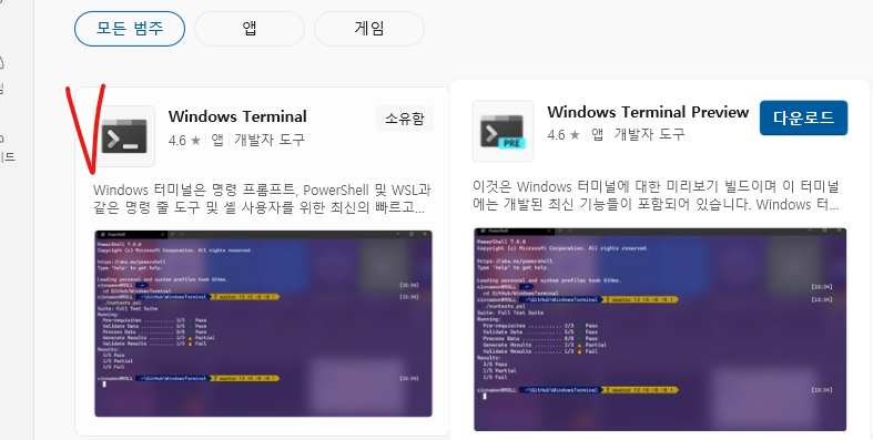 microsoft store에서 terminal을 다운받기 (사용하기 편함)