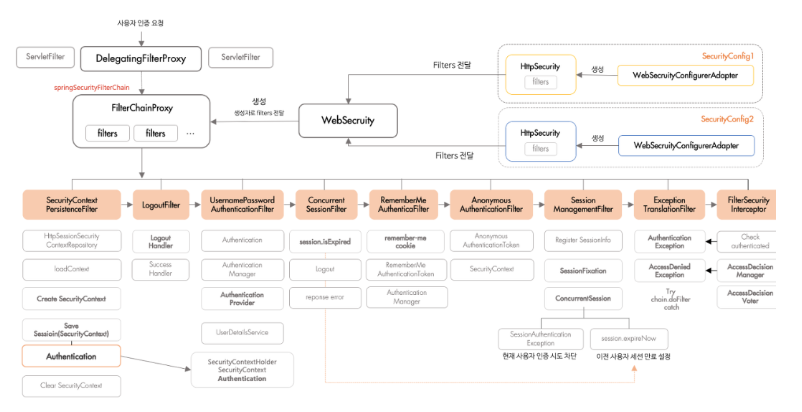 - 요청이 들어오면 DelegatingFilterProxy → FilterChainProxy가 이를 관리