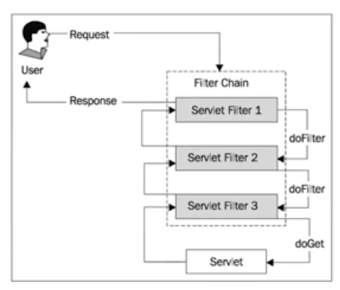 - 사용자의 Request(요청)이 들어오면 여러 개의 Servlet Filter를 거침