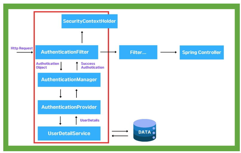 - Spring Security는 AuthenticationFilter → AuthenticationManager → AuthenticationProvider → UserDetailsService 순서로 요청을 처리함.