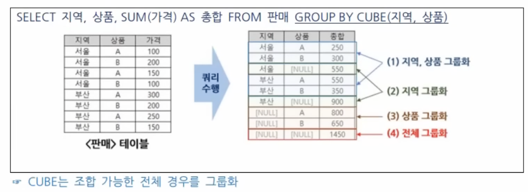 CUBE(컬럼1, 컬럼2)인 경우, (컬럼1, 컬럼2) -> 컬럼1 -> 컬럼2 -> 전체 행 순으로 그룹화