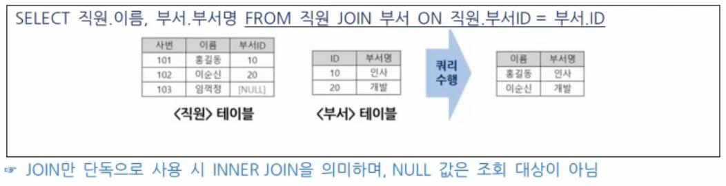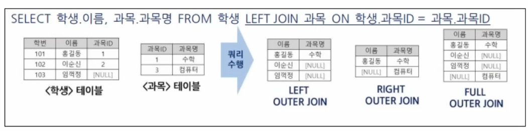 : 좌측 테이블이 기준이 되어 결과 생성, 우측 테이블에서 가져오는 컬럼이 없으면 NULL