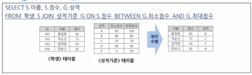 2) NON EQUI JOIN: 비교연산자(BETWEEN, >, <, !=)를 사용하는 조인