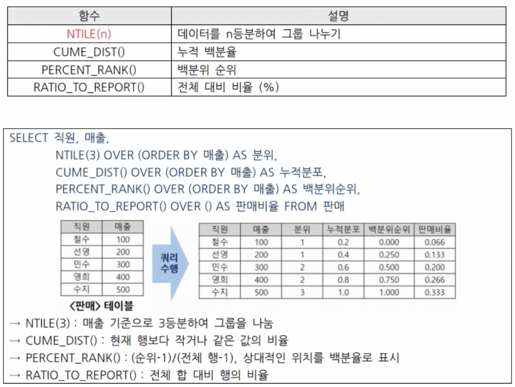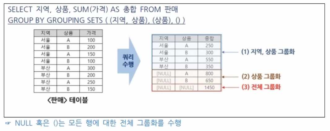 집계함수(COUNT, SUM, AVG, MIN, MAX)와 ROLLUP, CUBE, GROUPING SET등의 함수가 존재