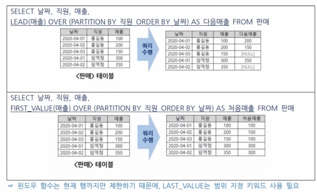 GROUP BY와 달리, 그룹화 하지 않고 각 행에 대하여 계산된 값을 반환하는 함수