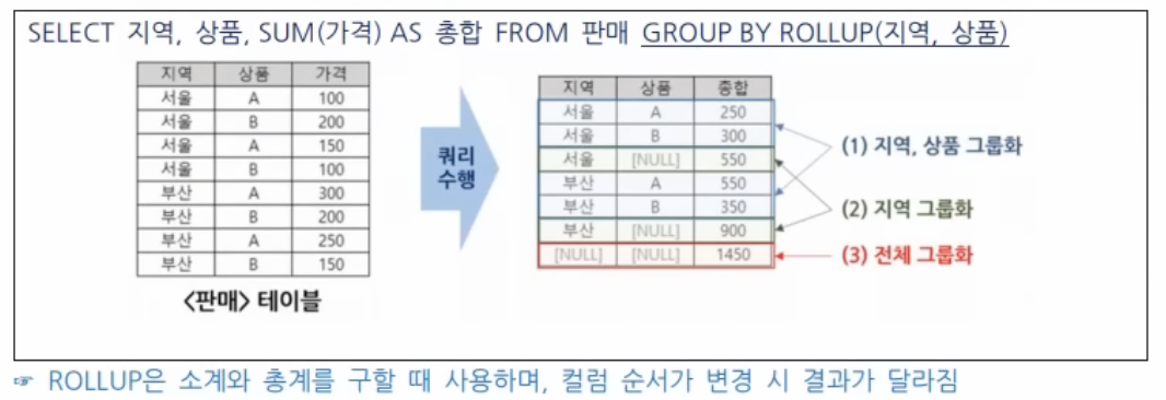 ROLLUP(컬럼1,컬럼2)인 경우, (컬럼1, 컬럼2) -> 컬럼1 -> 전체 행 순으로 그룹화