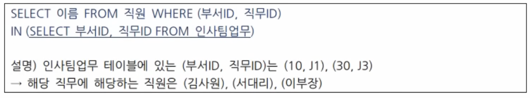 2) 다중열 서브쿼리: 서브쿼리가 두개 이상의 열을 반환