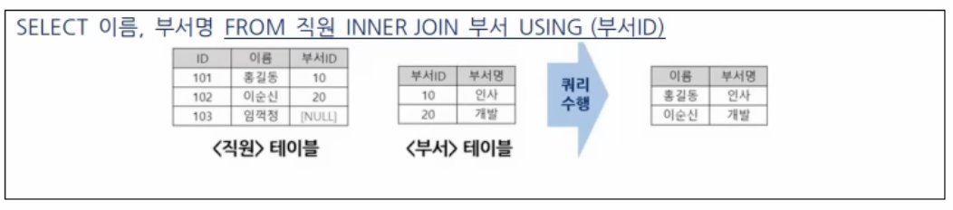 1) USING 조건절 : 컬럼명이 같은 컬럼들에 대해서 선택적으로 조인 가능