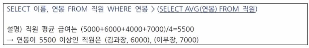 하나의 쿼리문(=메인쿼리) 안에 포함된 또 다른 쿼리문(=서브쿼리)
