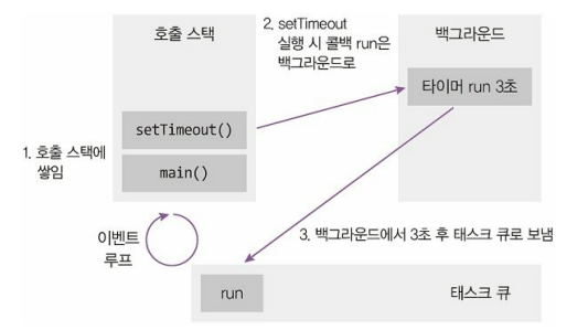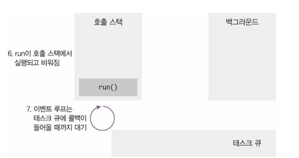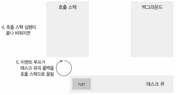 참고로 여러 이벤트가 동시에 발생했을 때 어떤 순서로 콜백 함수를 호출할지 판단하는 것을 이벤트 루프라고 하는데, 이벤트 루프는 호출 수택이 비어있을 때만 태스크 큐에 있는 함수를 호출스택으로 가져온다.