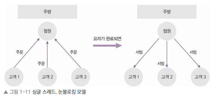 컴퓨터 작업을 처리할 수 있는 일손이나, 한 번에 한 가지 일밖에 처리하지 못함. 블로킹 방식에서는 비효율적임
