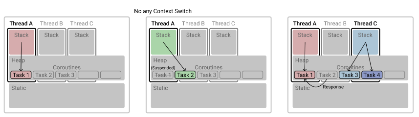 앞서 말했던 Context Switching 에 대한 이미지 이다. Coroutine 의 작업 단위는 Coroutine Object 객체 이므로 Heap 메모리에서 작동한다. 하나의 스레드에서 여러 Coroutine Object 들이 서로 양보하거나 완료될 때까지 실행되어 서로 협력 한다.