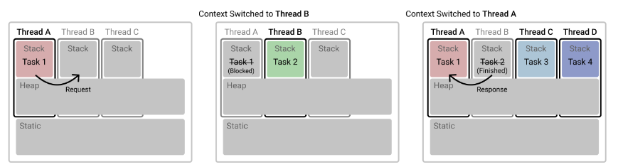 즉 Task 가 바뀔 때마다 Stack (자체 메모리 영역) 과 TCB 를 복사, 복구하는 일을 매번 해야 된다는 것이다.