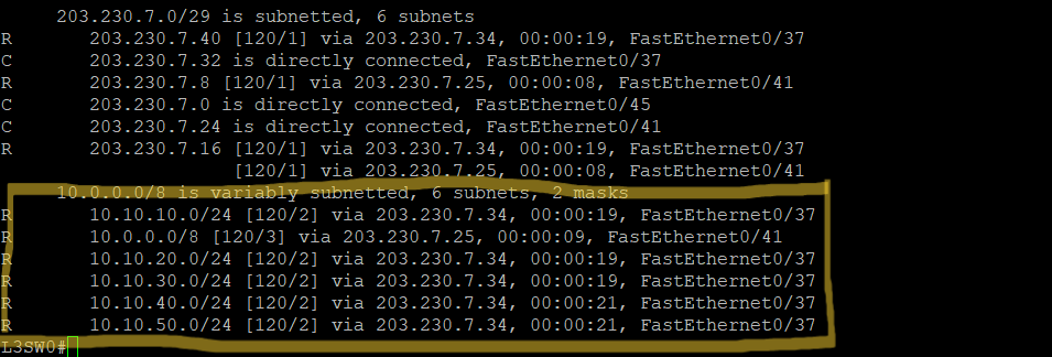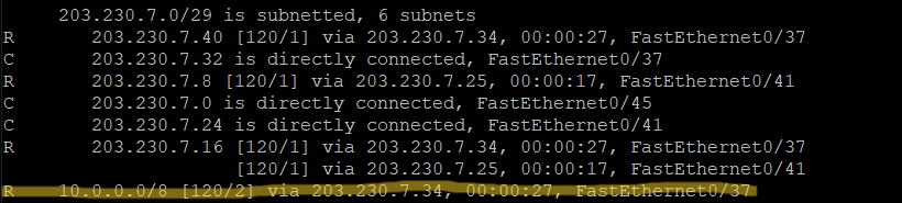 R: RIP 프로토콜로 학습된 경로203.230.7.40: 목적지 네트워크 주소[120/1]: 메트릭(120:최대 홉 수, 1:해당경로의 홉 수)via 203.230.7.34: 해당 경로로 가기 위한 다음 홉 IP 주소