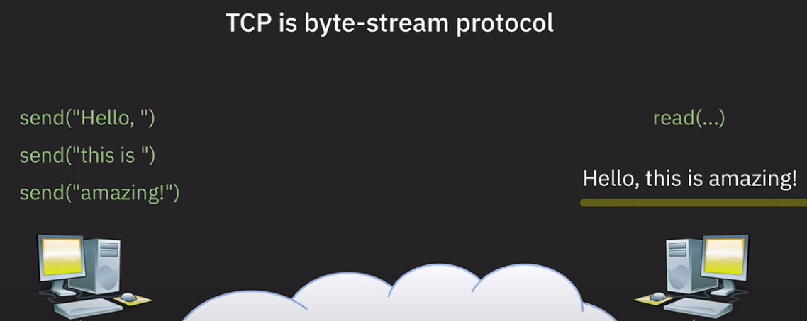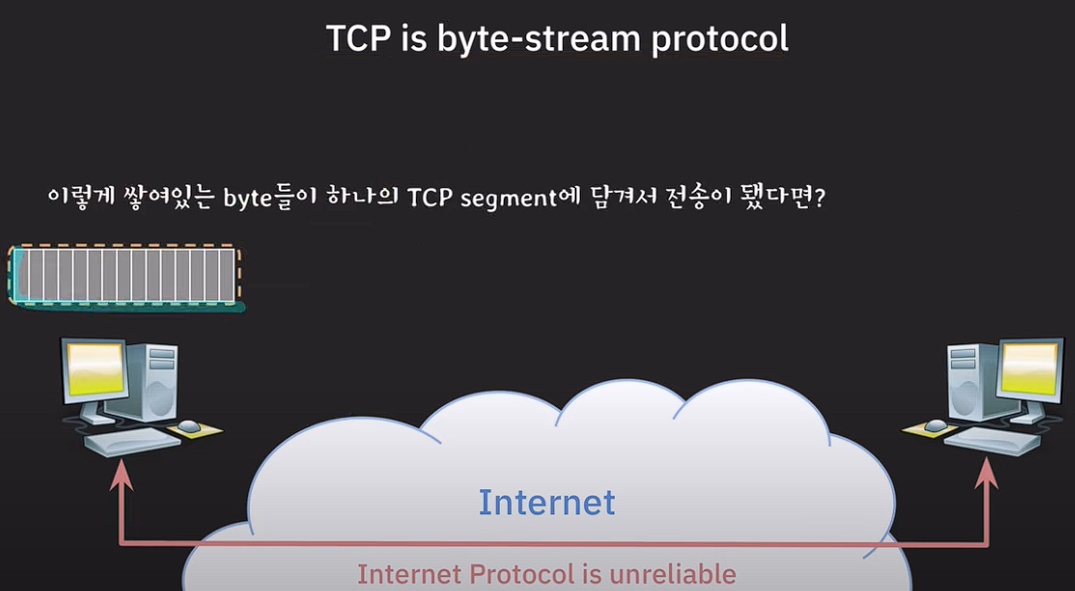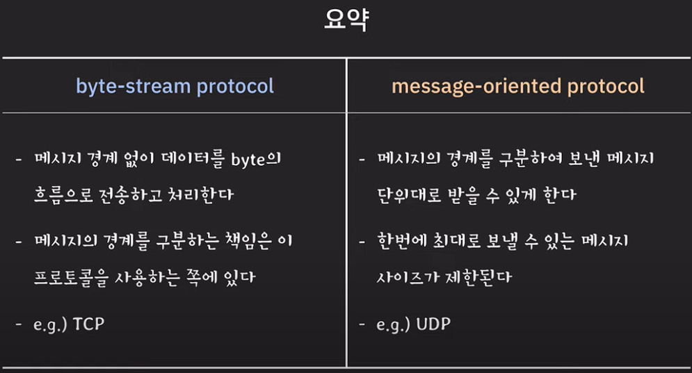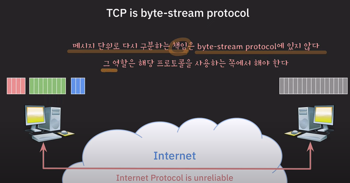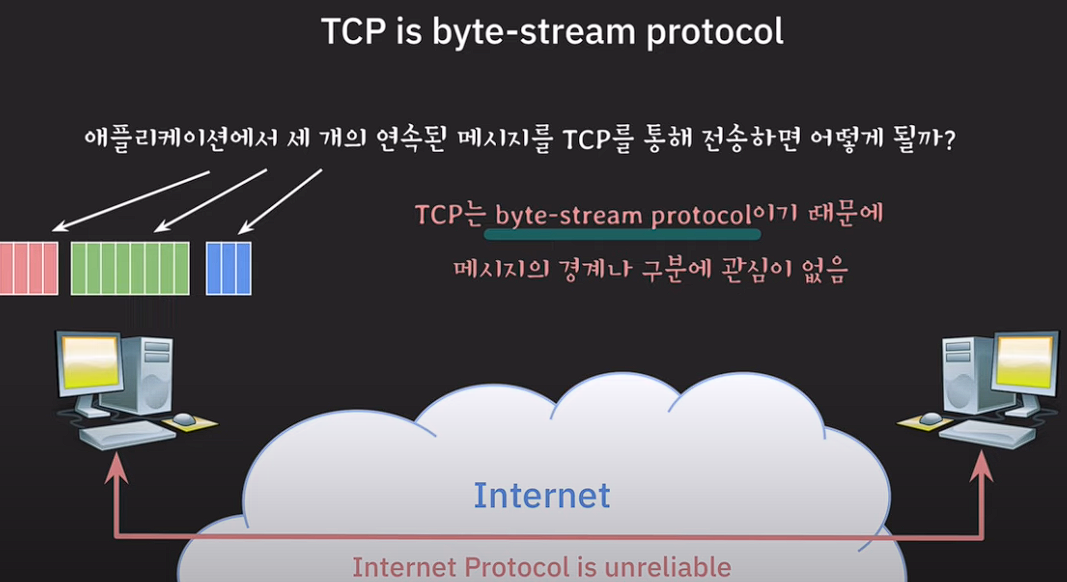 TCP는 byte-stream protocol이기 때문에 UDP와 다르게 메시지의 경계나 구분에 관심이 없다.
