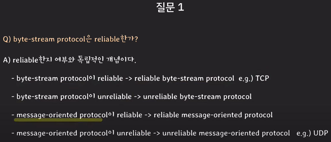 byte-stream protocol과 신뢰성은 독립적인 개념이다. byte-stream 전부가 신뢰성있는것이 아니라, 신뢰성있는 byte-stream protocol 중 하나가 TCP이다.