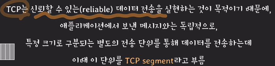 TCP는 신뢰성을 보장하기 위해 특정 크기로 구분되는 별도의 전송단위 TCP segment에 담아서 데이터를 전송한다.