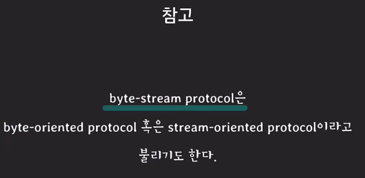 TCP 전송하고자 하는 메시지를 byte들의 흐름으로 인식하고 전송한다.