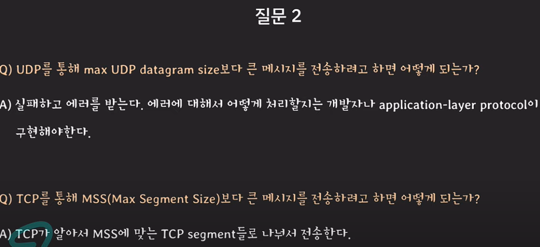 UDP는 메시지 단위로 보내기 때문에 데이터를 받는 호스트 측에서도 메시지 단위로 사용할 수 있다. 하지만, TCP는 하나의 byte 흐름으로 보내 데이터를 받는 호스트는 하나의 TCP segment를 받고 애플리케이션 레이어로 전달한다.