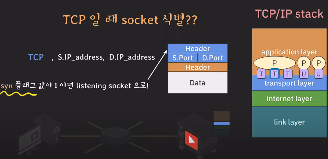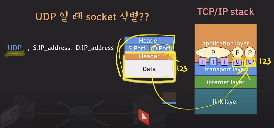 UDP의 socket은 고유하기 때문에 도착지 port만 확인하고 socket을 식별한다.