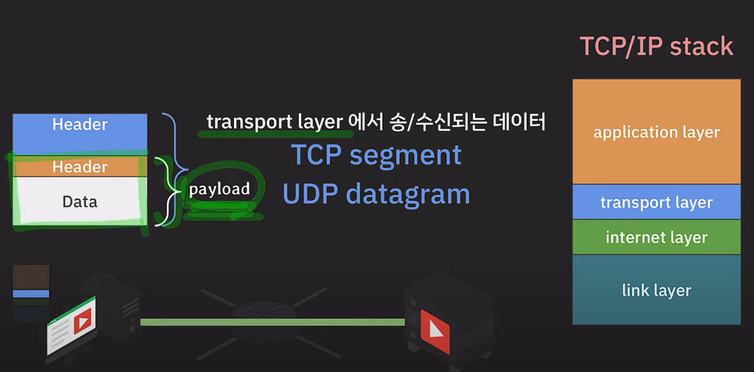 application layer에서 내려온 application layer header + data 위에 transport layer header를 추가한다. application layer header + data를 transport layer에서는 payload라고 부른다. 즉, payload는 각 layer마다 상대적인 개념이다.