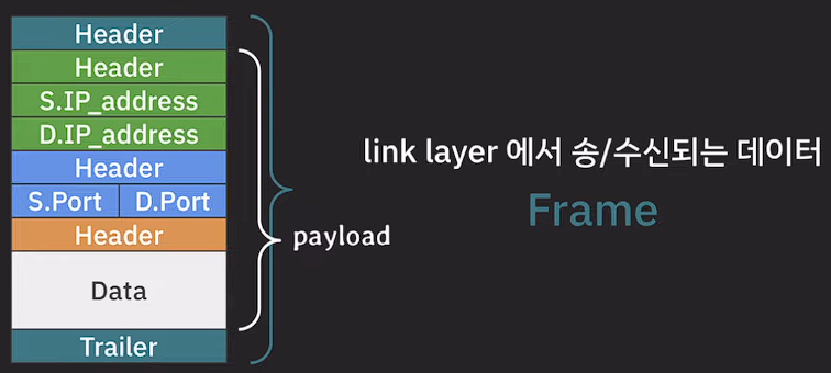 기존 payload + link layer의 header와 trailer가 붙으면 frame이라 부른다.