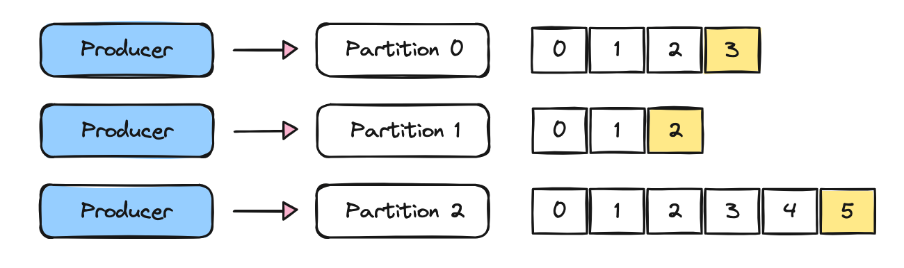 append 형식으로 추가된다.offset을 할당받게 되고 이 offset이 메시지를 식별할 수 있는 유니크한 값이 된다.offset을 기준으로 이벤트는 Consumer에 의해 순차적으로 처리되게 된다.Consumer도 파티션별로 따로 붙을 수 있어 병렬·분산 처리가 용이하다.