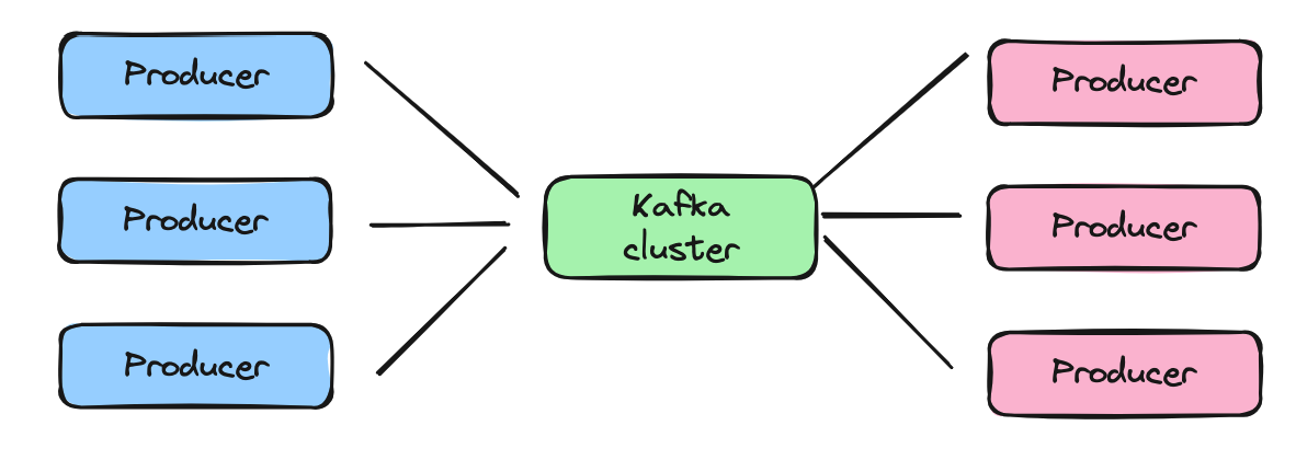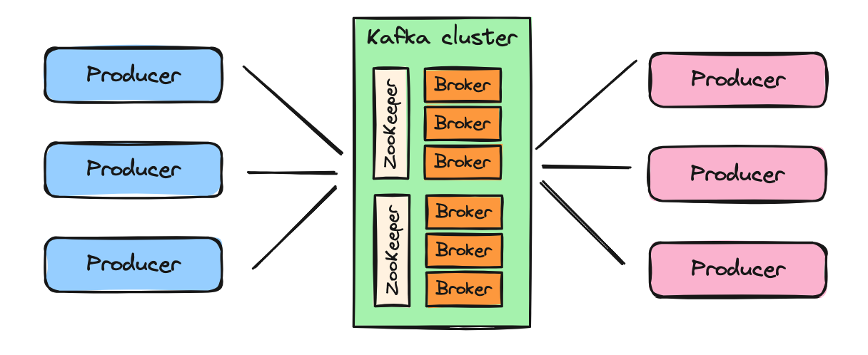 Producer는 데이터를 생성하고 Kafka Cluster에 전송하는 역할을 한다.Producer는 데이터를 생성하고 Kafka Topic으로 데이터를 보내는 역할을 한다.Producer는 데이터를 단일 Topic 혹은 여러 Topic에 보낼 수 있다. 또한 Topic 내 파티션에 분배한다.Producer가 여러 개일 경우 하나의 파티션을 기다릴 필요 없이 정해진 규칙에 따라 각각의 파티션에 저장하면 되기 때문에 데이터 처리 속도가 더 빨라진다.Consumer는 카프카의 Topic에서 데이터를 읽어오는 역할을 한다.Consumer는 토픽 내에 하나 이상의 파티션에서 데이터를 소비하고 처리한다.Consumer는 특정 토픽이나 파티션에서 데이터를 읽어오기 위해 Kafka Cluster에 연결된다.Consumer는 읽어오는 데이터를 로직에 따라 처리하거나 다른 시스템으로 전달할 수 있다.offset을 기록하여 자체적으로 읽은 데이터의 위치를 추적한다.Consumer는 중단된 지점부터 데이터를 다시 읽거나 특정 범위의 데이터만을 읽어올 수 있다.