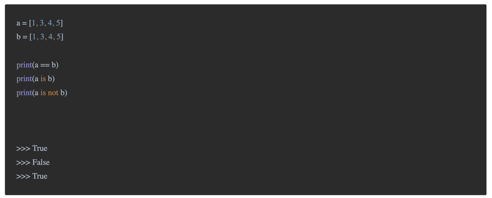 - a, b는 값이 같아서 a==b의 결과는 True지만