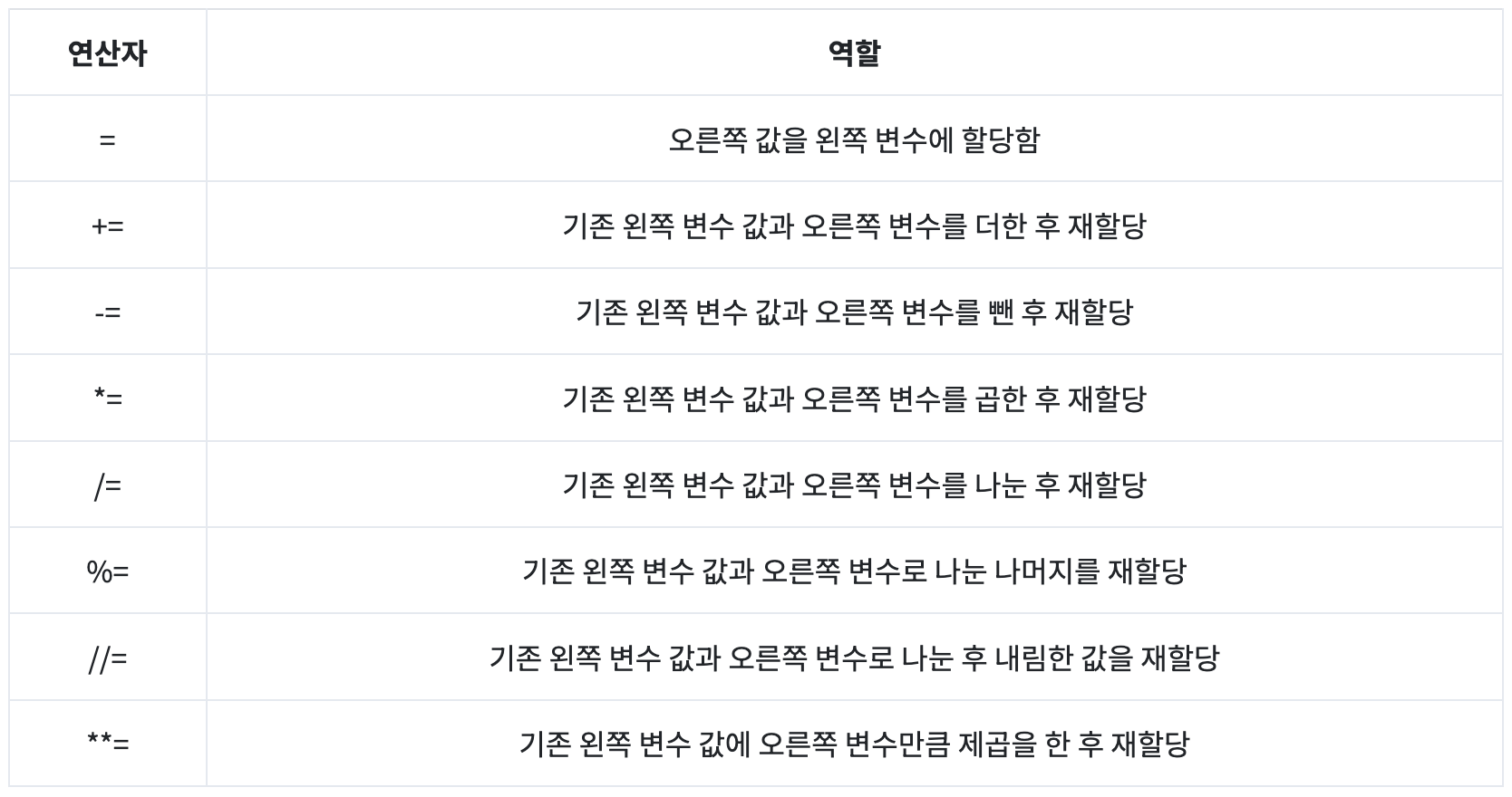 값을 변수에 할당하는 연산자로, 기본적인 = 외에 값을 계산 후 할당하는 연산자가 있다.