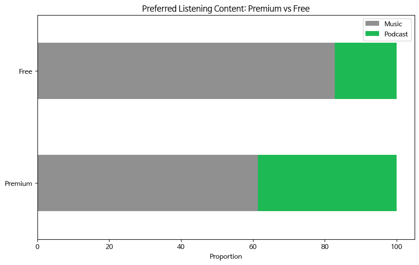 # 유료 이용자와 무료 이용자로 데이터 분리 premium = df[df['spotify_subscription_plan'] == 'Premium (paid subscription)'] free = df[df['spotify_subscription_plan'] == 'Free (ad-supported)'] # 유료 이용자와 무료 이용자의 선호 청취 콘텐츠 비율 변수 생성 (normalize : 정규화) premium_content_counts_pro = premium['preferred_listening_content'].value_counts(normalize=True) free_content_counts_pro = free['preferred_listening_content'].value_counts(normalize=True) # 시각화를 위한 데이터 프레임 생성 comp = pd.DataFrame({ 'Premium': premium_content_counts_pro * 100, 'Free': free_content_counts_pro * 100 }).fillna(0) # 색상 정하기 # colors1 = ['#77DFA9' if (x < max(premium_content_counts_pro)) else '#1DB954' for x in premium_content_counts_pro] # colors2 = ['#909090' if (x < max(free_content_counts_pro)) else '#000000' for x in free_content_counts_pro] colors = ['#909090','#1DB954'] # 바그래프 시각화 gragh = comp.T.plot(kind='barh', stacked=True, figsize=(10, 6), color=colors) plt.title('Preferred Listening Content: Premium vs Free') plt.xlabel('Proportion') plt.ylabel('') plt.legend(['Music', 'Podcast']) # for i in gragh.containers: # gragh.bar_label(i, fmt='%.f', label_type='center', color = 'Black') plt.show()
