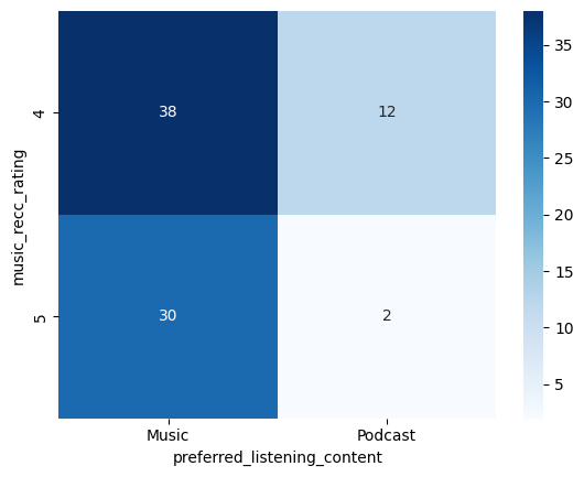 # 필터링 (유료 구독의사가 있고 음악 추천 시스템 만족도가 높은(4점 이상) 이용자) filtered = df[(df['music_recc_rating'] > 3) & (df['premium_sub_willingness'] == 'Yes')] # 무료 플랜 이용자 중 구독 의사가 있는 사람 # filtered = df[(df['spotify_subscription_plan'] == 'Free (ad-supported)') & (df['premium_sub_willingness'] == 'Yes')] crosstab = pd.crosstab(filtered['music_recc_rating'], filtered["preferred_listening_content"]) sns.heatmap(crosstab, annot=True, fmt="d", cmap = "Blues") plt.show()