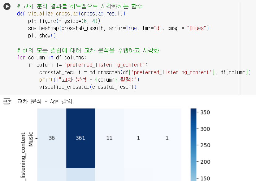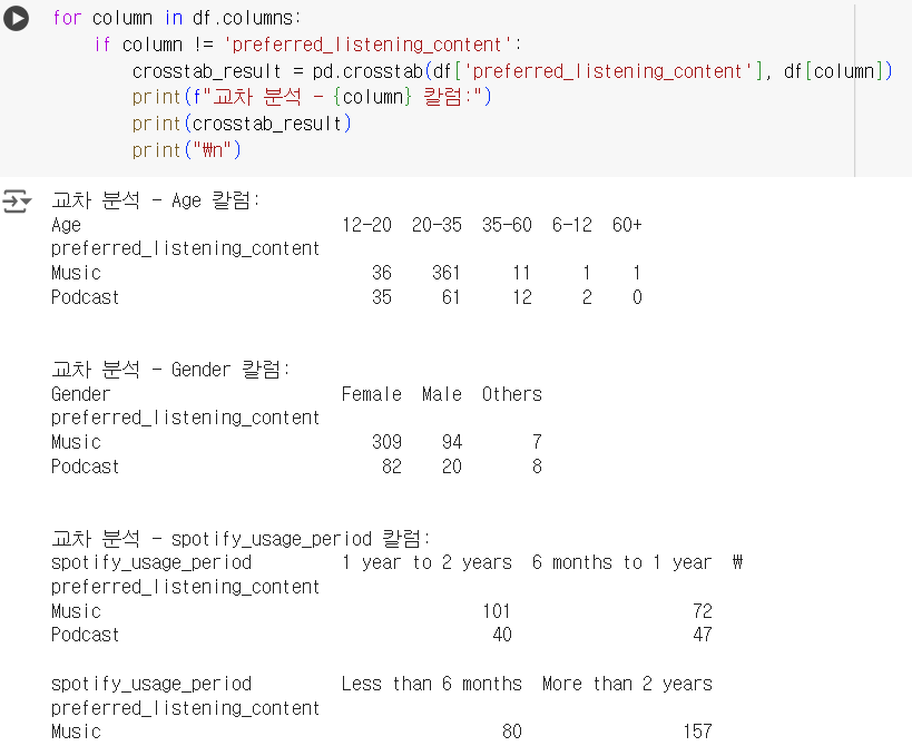 # 한 컬럼을 기준하여 그 컬럼이 아닌 다른 컬럼들과 교차 분석 반복 실행 for column in df.columns: if column != 'preferred_listening_content': crosstab_result = pd.crosstab(df['preferred_listening_content'], df[column]) print(f"교차 분석 - {column} 칼럼:") print(crosstab_result) print("\n")