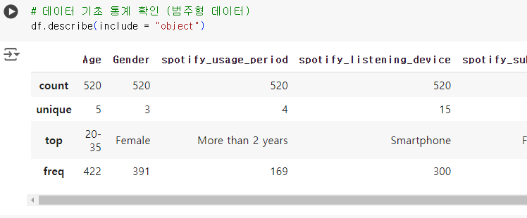 # 데이터 기초 통계 확인 (범주형 데이터) df.describe(include = "object")