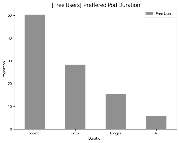 # 유료 이용자와 무료 이용자로 데이터 분리 # premium = df[(df['spotify_subscription_plan'] == 'Premium (paid subscription)') & (df['pod_lis_frequency'] != "Never")] free = df[(df['spotify_subscription_plan'] == 'Free (ad-supported)') & (df['pod_lis_frequency'] != "Never")] # 유료 이용자와 무료 이용자의 선호 청취 팟캐스트 컨텐츠 길이 비율 변수 생성 (normalize : 정규화) # premium_pod_counts = premium['fav_pod_genre'].value_counts(normalize=True).head(5) free_pod_counts = free['preffered_pod_duration'].value_counts(normalize=True).head(5) # 시각화를 위한 데이터 프레임 생성 comp = pd.DataFrame({ # 'Premium Users': premium_pod_counts * 100, 'Free Users': free_pod_counts * 100 }).fillna(0) # 데이터 크기 내림차순으로 컬럼 정렬 comp_sorted = comp.loc[comp.sum(axis=1).sort_values(ascending=False).index] # 색상 정하기 colors = ['#909090'] # 바그래프 시각화 comp_sorted.plot(kind='bar', figsize=(8, 6), color = colors) plt.title('[Free Users] Preffered Pod Duration', size = 15) plt.xlabel('Duration') plt.ylabel('Proportion') plt.xticks(rotation=0) plt.legend() plt.show()