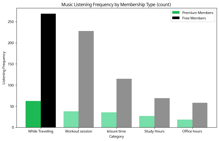 # 여행 count # 'spotify_subscription_plan' 열의 값이 'FREE'인 행을 df_free에 저장 df_free = df[df['spotify_subscription_plan'] == 'Free (ad-supported)'] # 'spotify_subscription_plan' 열의 값이 'premium'인 행을 df_premium에 저장 df_premium = df[df['spotify_subscription_plan'] == 'Premium (paid subscription)'] data1=df_premium #premium맴버쉽 사용중music_lis_frequency 칼럼의 합 music_lis_frequency_premium = data1[['While Traveling','Study Hours' ,'leisure time','Office hours','Workout session']].sum() music_lis_frequency_premium data2=df_free #free맴버쉽 사용중music_lis_frequency 칼럼의 합 music_lis_frequency_free = data2[['While Traveling','Study Hours' ,'leisure time','Office hours','Workout session']].sum() music_lis_frequency_free data=df_premium #premium맴버쉽 사용중feel칼럼의합 feel_premium = data[['Sadness or melancholy','Social gatherings or parties' ,'Relaxation and stress relief','Uplifting and motivational']].sum() feel_premium data=df_free #free맴버쉽 사용중feel칼럼의합 feel_free = data[['Sadness or melancholy','Social gatherings or parties' ,'Relaxation and stress relief','Uplifting and motivational']].sum() feel_free #백분위로 계산하기 total_premium = music_lis_frequency_premium.sum() total_free = music_lis_frequency_free.sum() music_lis_frequency_premium_pct = music_lis_frequency_premium music_lis_frequency_free_pct = music_lis_frequency_free import matplotlib.pyplot as plt import numpy as np # 데이터프레임 'music_lis_frequency_free'와 'music_lis_frequency_premium' 백분위 비교 차트 생성 # 데이터 정렬 ★ music_lis_frequency_premium_pct = music_lis_frequency_premium_pct.sort_values(ascending=False) music_lis_frequency_free_pct = music_lis_frequency_free_pct.sort_values(ascending=False) x = np.arange(len(music_lis_frequency_premium_pct)) # 막대 그래프의 x축 좌표 width = 0.4 # 막대 그래프의 너비 fig, ax = plt.subplots(figsize=(10, 6)) # 프리미엄 회원 데이터 그리기 (색상 변경) ★ # ax.bar(x - width/2, music_lis_frequency_premium_pct, width, label='Premium Members', color='#23D950') colors = ['#77DFA9' if (x < max(music_lis_frequency_premium_pct)) else '#1DB954' for x in music_lis_frequency_premium_pct] # #1DB954: 스포티파이 컬러 ax.bar(x - width/2, music_lis_frequency_premium_pct, width, label='Premium Members', color=colors) # 무료 회원 데이터 그리기 (색상 변경) ★ # ax.bar(x + width/2, music_lis_frequency_free_pct, width, label='Free Members', color='#F2F2F2') colors = ['#909090' if (x < max(music_lis_frequency_free_pct)) else '#000000' for x in music_lis_frequency_free_pct] ax.bar(x + width/2, music_lis_frequency_free_pct, width, label='Free Members', color=colors) # 그래프 제목 및 축 라벨 설정 ax.set_title('Music Listening Frequency by Membership Type (count)') ax.set_xlabel('Category') ax.set_ylabel('Listening Frequency') ax.set_xticks(x) # ax.set_xticklabels(['While Traveling', 'Study Hours', 'Leisure Time', 'Office Hours', 'Workout Session']) ax.set_xticklabels(music_lis_frequency_premium_pct.index) # x축 라벨을 정렬된 순서로 변경 ★ # 범례 표시 ax.legend() # 그래프 출력 plt.show()