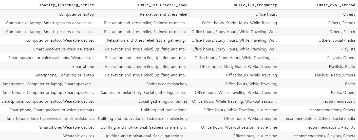 columns_to_encode = ['spotify_listening_device', 'music_Influencial_mood', 'music_lis_frequency', 'music_expl_method'] dup = [df[i].unique() for i in columns_to_encode] # 딕셔너리 생성 unique_values_dict = dict(zip(columns_to_encode, dup)) # 딕셔너리를 데이터프레임으로 변환 unique_values_df = pd.DataFrame(dict([(k, pd.Series(v)) for k, v in unique_values_dict.items()])) # 데이터프레임 출력 unique_values_df # 데이터프레임 정렬 (열 별로 개별 정렬) sorted_df = unique_values_df.apply(lambda x: x.sort_values().reset_index(drop=True)) # 데이터프레임 출력 sorted_df