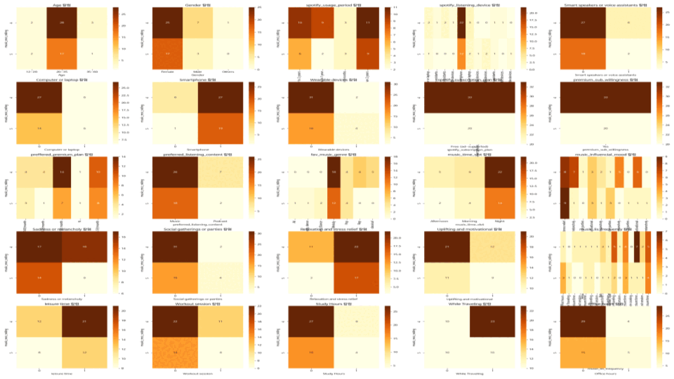 범주형 - 범주형데이터를 분석하기 위해 교차검증 사용 후 히트맵으로 시각화- 추천을 통해 음악을 처음 접하는 사람이 가장 많다.
