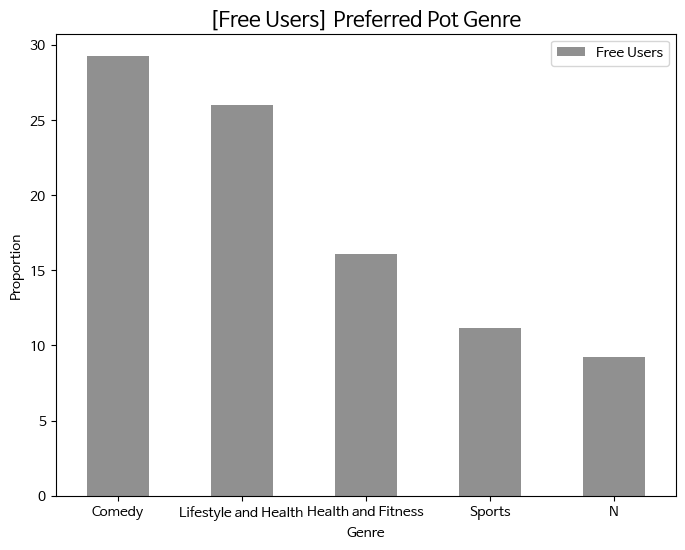 # 유료 이용자와 무료 이용자로 데이터 분리 # premium = df[(df['spotify_subscription_plan'] == 'Premium (paid subscription)') & (df['pod_lis_frequency'] != "Never")] free = df[(df['spotify_subscription_plan'] == 'Free (ad-supported)') & (df['pod_lis_frequency'] != "Never")] # 유료 이용자와 무료 이용자의 선호 청취 팟캐스트 장르 비율 변수 생성 (normalize : 정규화) # premium_pod_counts = premium['fav_pod_genre'].value_counts(normalize=True).head(5) free_pod_counts = free['fav_pod_genre'].value_counts(normalize=True).head(5) # 시각화를 위한 데이터 프레임 생성 comp = pd.DataFrame({ # 'Premium Users': premium_pod_counts * 100, 'Free Users': free_pod_counts * 100 }).fillna(0) # 데이터 크기 내림차순으로 컬럼 정렬 comp_sorted = comp.loc[comp.sum(axis=1).sort_values(ascending=False).index] # 색상 정하기 colors = ['#909090'] # 바그래프 시각화 comp_sorted.plot(kind='bar', figsize=(8, 6), color = colors) plt.title('[Free Users] Preferred Pod Genre', size = 15) plt.xlabel('Genre') plt.ylabel('Proportion') plt.xticks(rotation=0) plt.legend() plt.show()