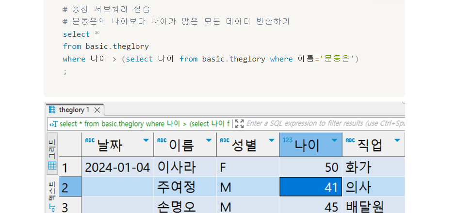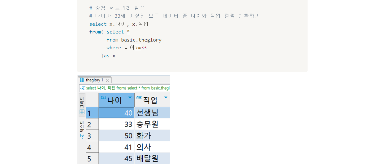 서브쿼리 실행(안쪽에 위치한 쿼리) > 메인쿼리 실행(바깥쪽에 위치한 쿼리)