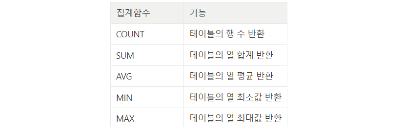 집계 함수는 SELECT 문에서 사용, 종류는 총 5가지