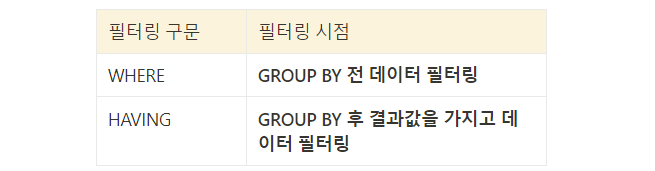 3) WHERE절 뒤 GROUP BY 기준컬럼 작성 (WHERE 절 생략 가능)