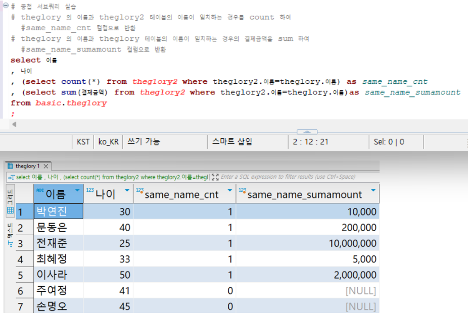 2) 스칼라 서브쿼리: SELECT 절에서 사용, 하나의 컬럼처럼 사용, 서로 다른 테이블 필요