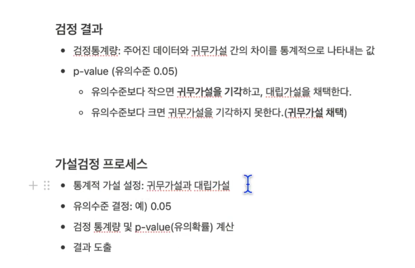 가설설정, 통계적 의미 해석(P-value), 가설검정(T검정, 카이제곱검정)이 있다.