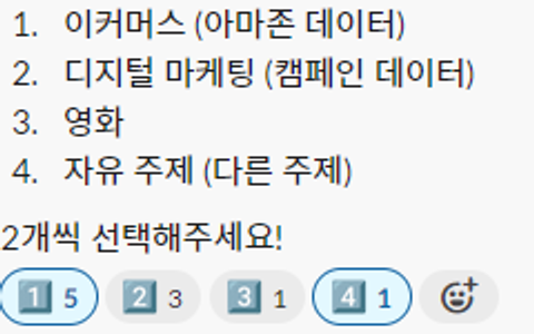 내일 오전까지 데이터셋을 찾고 분석 주제 ~ 기획을 정하기로 하고 오늘 하루 마무리..